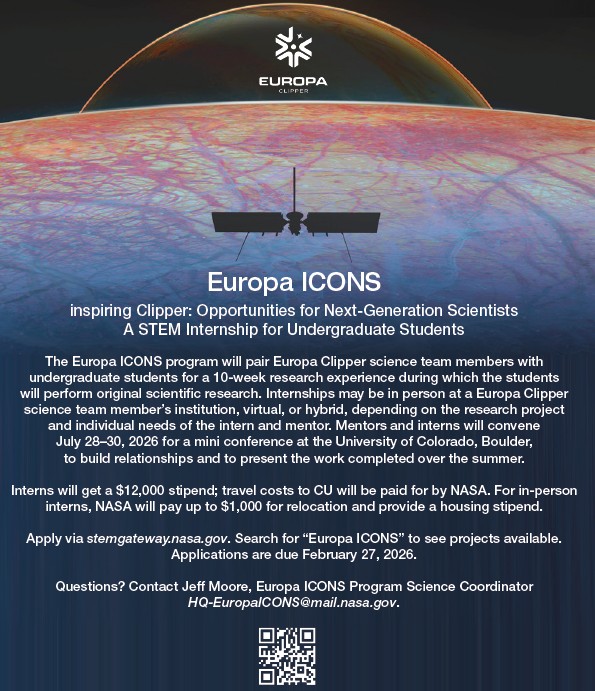 The Europa ICONS program will pair Europa Clipper science team members with undergraduate students for a 10-week research experience during which the students will perform original scientific research.